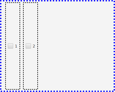 <HBox xmlns:fx="http://javafx.com/fxml"> <HBox> <CheckBox text="1"/> </HBox> <HBox> <CheckBox text="2"/> </HBox> </HBox> -