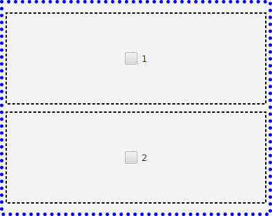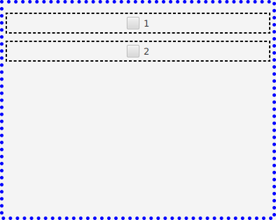 <VBox xmlns:fx="http://javafx.com/fxml"> <HBox VBox.vgrow="ALWAYS"> <CheckBox text="1"/> </HBox> <HBox VBox.vgrow="ALWAYS"> <CheckBox text="2"/> </HBox> </VBox>